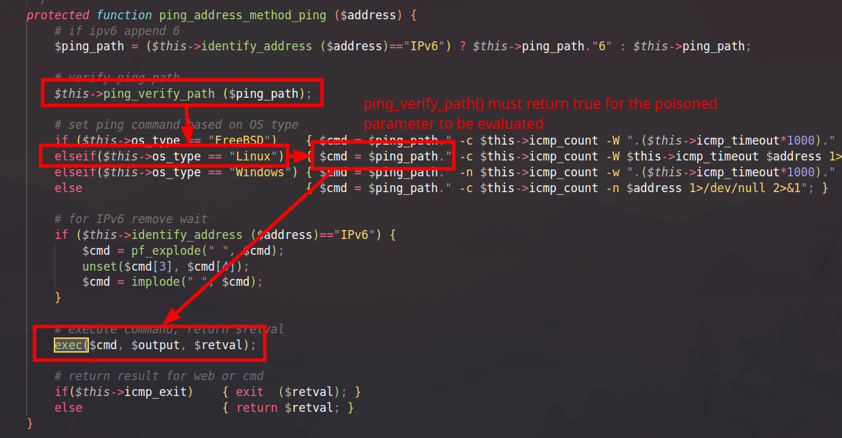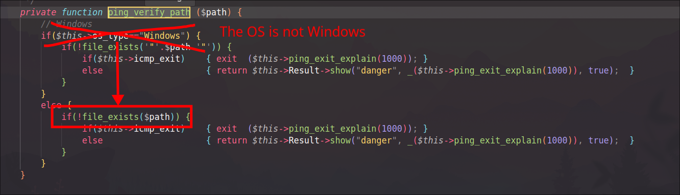 $cmdfrom$ping_pathand then callsexec($cmd, ...). - The verification logic is effectively “does it exist” (via