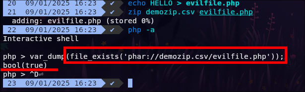 The key detail is that file_exists() supports the phar:// stream wrapper. That wrapper can point inside an archive (PHAR, and also ZIP-like archives) even if the uploaded file has a misleading extension (for example .csv). In other words, file_exists('phar:///path/to/archive.csv/some/entry') can return true if the entry exists inside the archive.