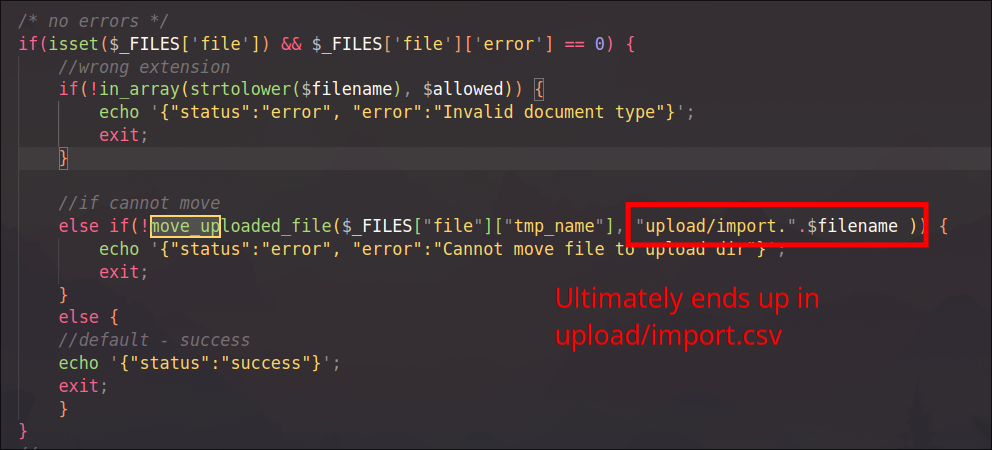 The uploaded file does not have to be a valid CSV file. If the import fails, the file will not be deleted from the server. We also know where it will be stored from the import-verify.php script: